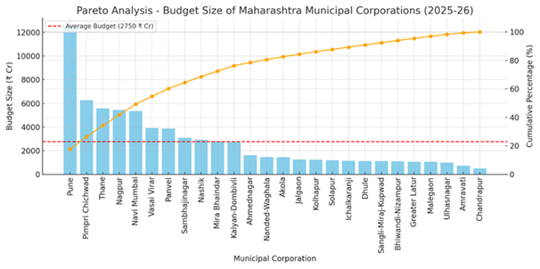 The numbers tell us something striking: just six cities - Pune, Pimpri Chinchwad, Thane, Nagpur, Navi Mumbai, and Vasai Virar - command more than half of all municipal budgets in the state. Pune alone holds nearly 18%. By the way, we have kept Mumbai out of the analysis as it is a clear outlier with a budget size of Rs. 70,000 crores.
